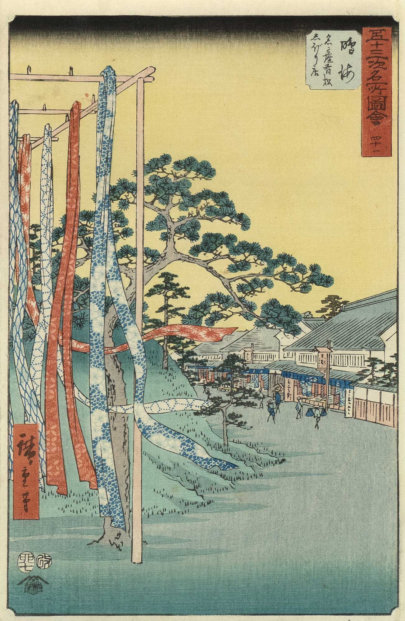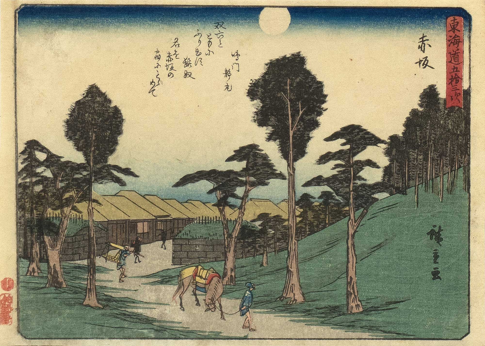 Utagawa HIROSHIGE (1797–1858) zählt zu den bedeutendsten ukiyo‑e-Landschaftsmalern. Als Schüler von Utagawa Toyohiro fertigte Hiroshige Bilderbücher mit Schauspieler-Darstellungen (yakusha-ehon), Heldenbilder (musha‑e) und Darstellungen schöner Frauen (bijin-ga). Seinen Ruf als Landschaftsmaler begründete er mit der Serie „53 Stationen der Tōkaidō“ (1833–1834), in denen er Landschaften zu den vier Jahreszeiten und das Alltagsleben der dort ansässigen Menschen darstellte. In seinen späteren Jahren malte er u. a. die „100 Ansichten berühmter Orte Edos“ und „Berühmte Orte in mehr als 60 Provinzen“. Darüber hinaus entwarf Hiroshige eine Vielzahl von Fächerblättern und schuf meisterhafte Holzschnitte mit Blumen- und Vogelmotiven.