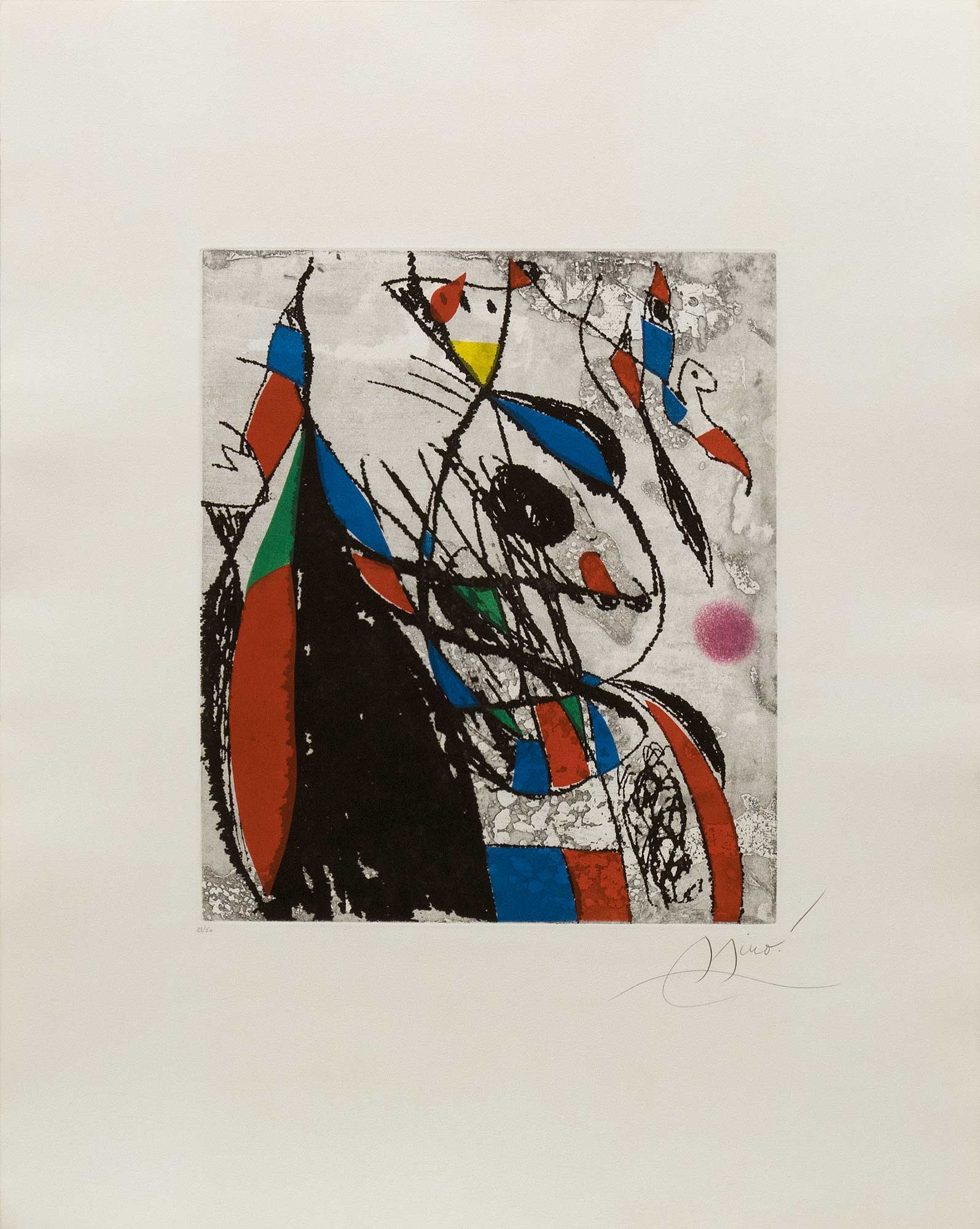 Joan MIRÓ was born in Barcelona on April 20, 1893. After studying at the Escola de la Llotja and the Academia Gali in Barcelona, Miró worked as a freelance artist from 1915. From 1920 he traveled regularly to Paris and moved to the French capital in 1921. There he met many fellow artists, became involved with Dadaism, Fauvism and Cubism, and joined the Surrealist circle of artists around André Breton. In 1928 Miró presented his works at the Georges Bernheim Gallery in Paris. This exhibition made Miró known as a painter. In 1930 Miró was able to show his works for the first time in New York at the Valentine Gallery. From 1935 to 1938, several international exhibitions of Surrealist works followed. During the Second World War Miró retreated to Mallorca and lived temporarily in Montroig and Barcelona. In 1947 he took part in the Surrealist exhibition at the Galerie Maeght, which represented him in Europe from then on. That same year, the artist visited the U.S. for several solo exhibitions, including a retrospective at the Museum of Modern Art in New York. In 1954, Miró’s works were shown in an exhibition in Germany for the first time and he was awarded the Grand Prize for Graphic Arts at the Venice Biennale. In 1956 the artist moved his main residence to Mallorca. He built a large studio and founded the Fundació Joan Miró in Barcelona in 1971. Miró’s paintings are characterized by a simplistic formal language and a strong use of color. The artist developed his own style from the 1930s onwards. From 1940 to 1948 he created numerous sculptures, graphics, ceramics and murals. His cheerful and whimsical works, created in the 1940s and 1950s, established Miró’s worldwide fame. The painter, graphic artist and sculptor is one of the most famous representatives of classical modernism. Joan Miró died on December 25, 1983 in Palma de Mallorca. 1960 — first exhibition participation, 1983 — first solo exhibition at Galerie Welz.